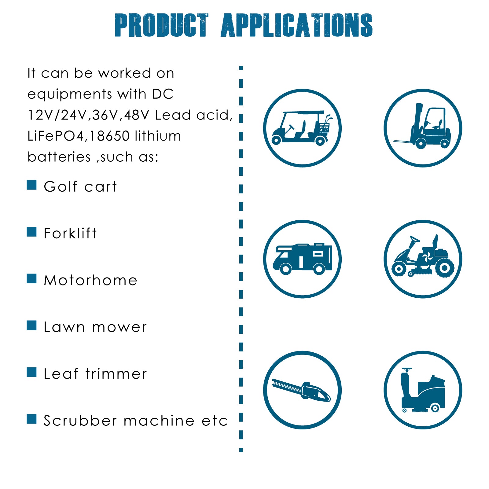 MULTI-FUNCTIONS IN A SCREEN --- User can view real-time battery power(percentage and progress bars),battery voltage,and selectable battery types(Lead acid,LiFePO4,18650 lithiun batteries) and voltages(DC 12V,24V,36V,48V) in a screen when battery is connected. Battery voltage measurement range: DC8V to 70V.