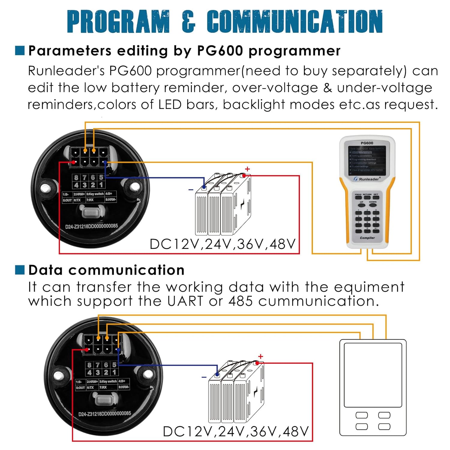 - PROGRAM & COMMUNICATION ---- User can program some working parameters by Runleader's PG600 programmer(it need to order seperately), such as low battery reminder, over-voltage & under-voltage reminders,colors of LED bars, backlight modes etc.; It can transfer the working data with the equiment which support the UART or 485 cummunication.