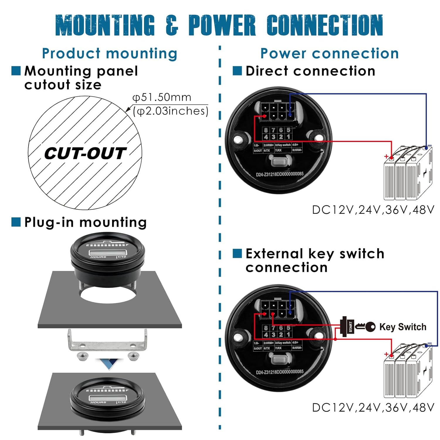 - PRODUCT INSTALLATION ---- Easy to mount it by drill-in and plug-in, the panel cutout size: φ51.50mm(φ2.03 inches); Connect the "+" and "-" poles by 8-hole connector assembly to enable the gauge to run, and connect the "HMR+" or "HMR-" pole to activate the hour meter function.