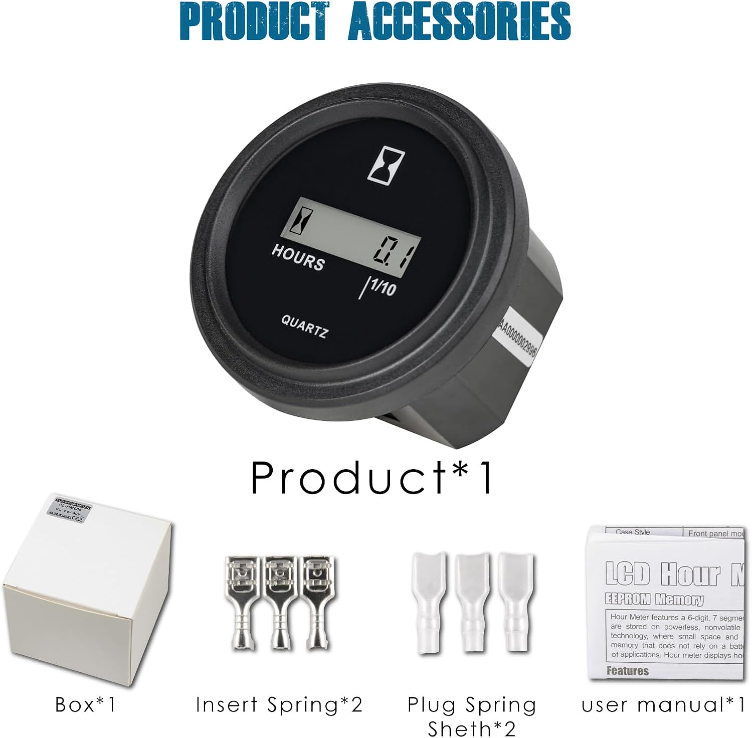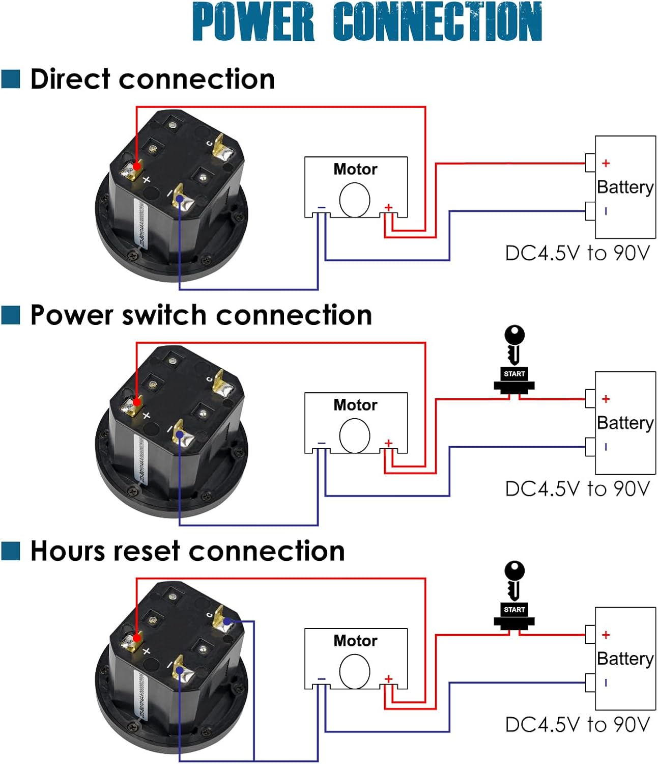 - PRODUCT INSTALLATION ---- Easy to mount it by drill-in and snap-in at any proper place, panel cut-out size: 43.50mmx39.50mm(1.71 inches*1.56 inches) ; Connect the " + " to " - " to start the hours record, connect "C" with "-" to reset the hours value.