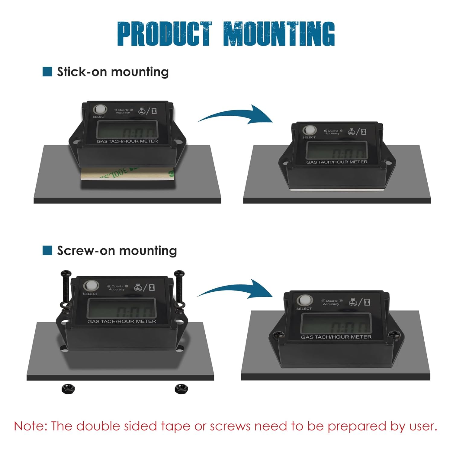- MOUNTING & SIGNAL CONNECT ---- It can be mounted by stick-on or screw-in at any proper place of equipment; Receipt of engine signal by wire connection with spark plug by wrapping(5-8 circles, inductive cable length:1.75meters/68.8 inches)