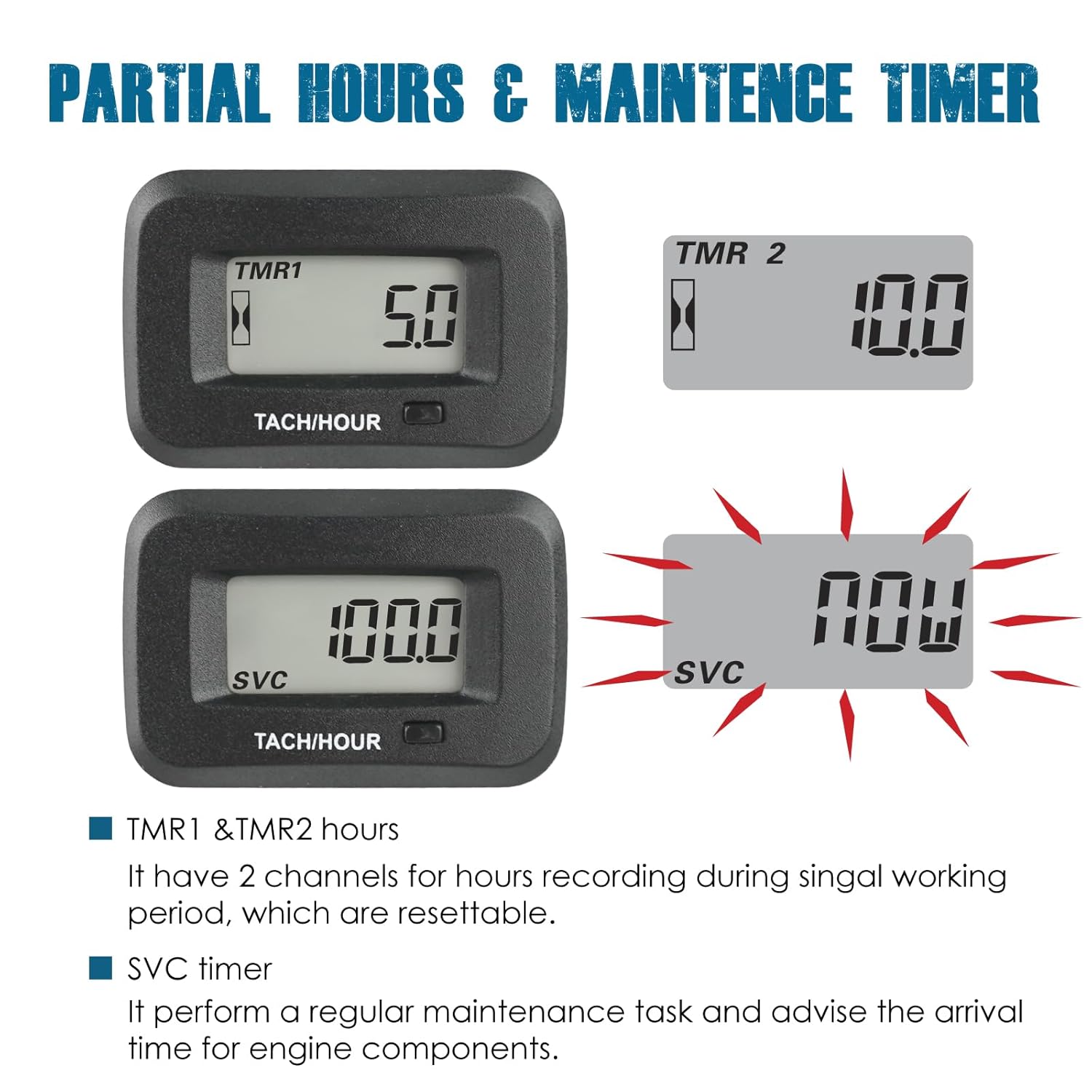 - TACH/HOUR METER ---- It display the real-time RPM value and begin to record the total working hours(TOT) when engine is on,and display the total hours value when engine is off; It perform a regular maintenance task(SVC) for engine component, advise the arrival time; RPM measurement range: 0 to 25,000 RPM, TOT hours range: 0 to 99,999 hours,SVC hours range: 0 to 1000 hours.