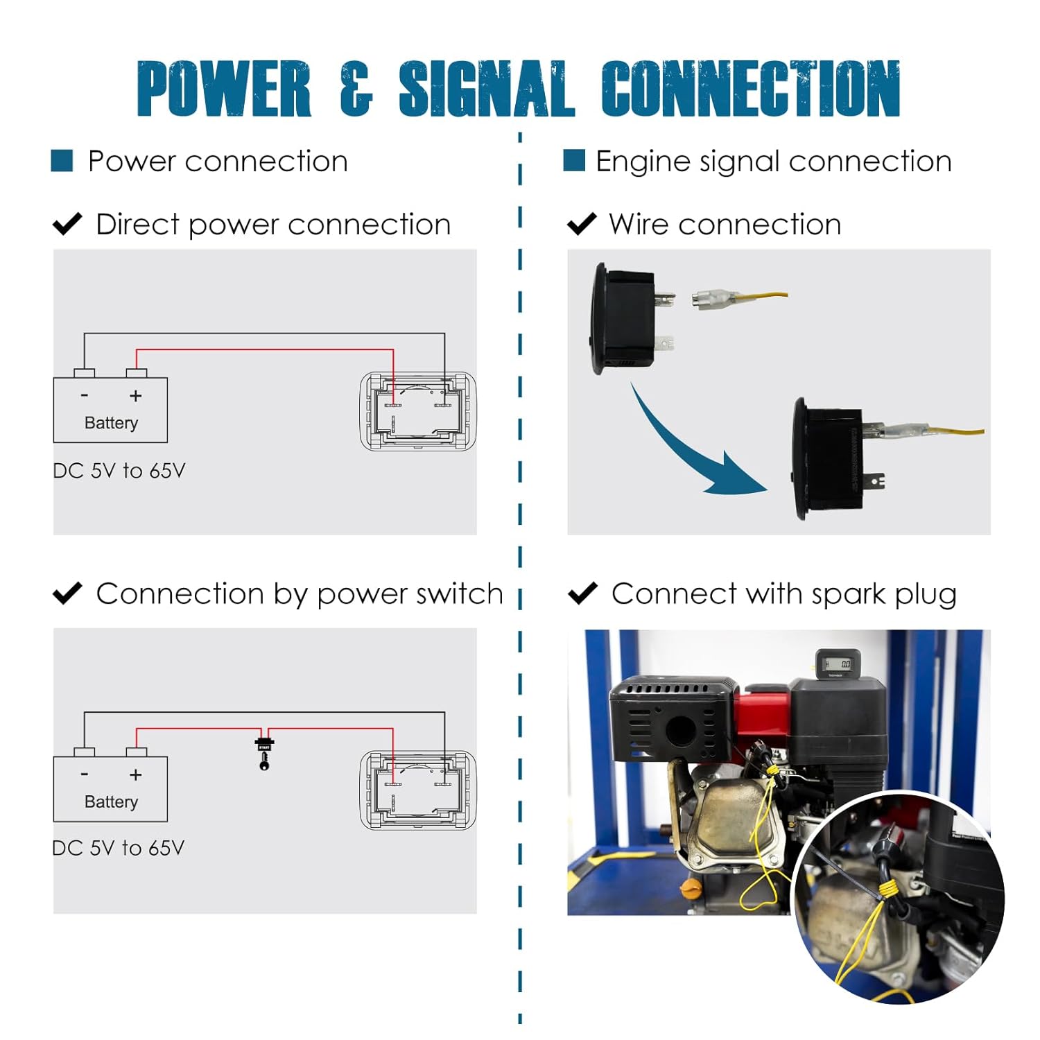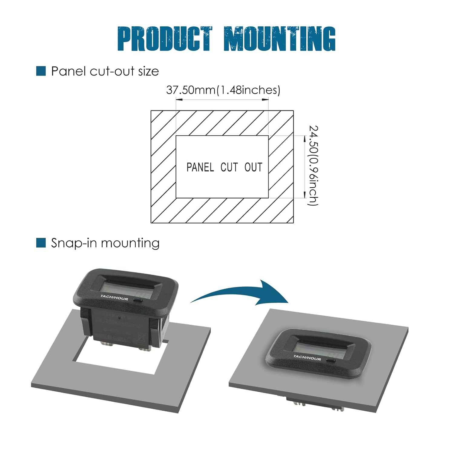 - PRODUCT INSTALLATION ---- You can mount it at any proper place by drill-in and snap-in by panel cut-out size: 37.50mm*24.50mm(1.48 inches*0.96 inch);Plug-in and one-wire connection with spark plug(5-8 circles at least) to pick up the working signal; Total length of signal wire: 1.20 meters(47.24 inches).