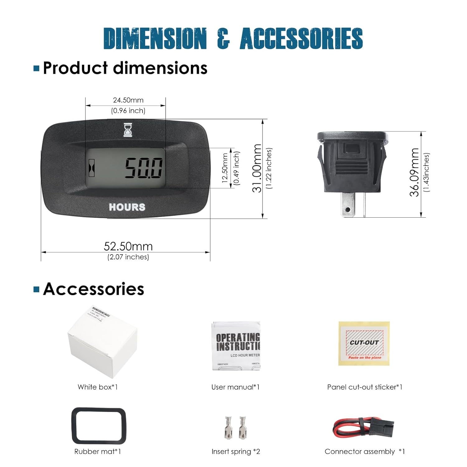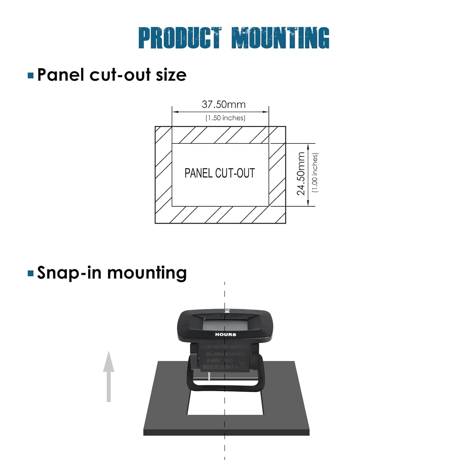 - PRODUCT INSTALLATION ---- Plug-in mounting by panel cutout size: 37.50mm*24.50mm(1.5 inches*1 Inch), the fixed rubber mate will keep the mounting more stably;Connect the postive and negative poles to active the hours tracking on.