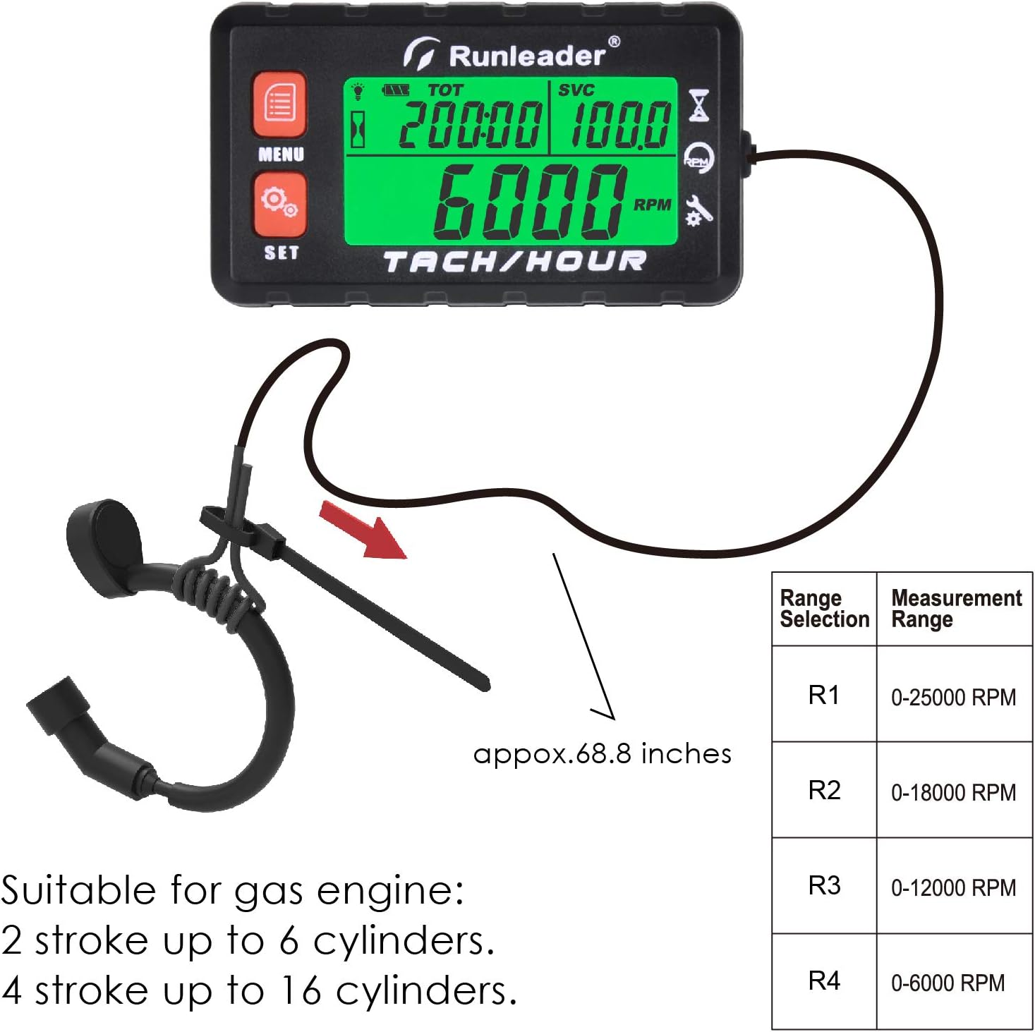 Runleader RL-HM058B Hour Meter Tachometer, Maintenance Reminder, Alert RPM Reminder, Initial Hours Settable, Battery Replaceable, Use for Lawn Mower Generator Marine ATV and Gas Powered Equipment