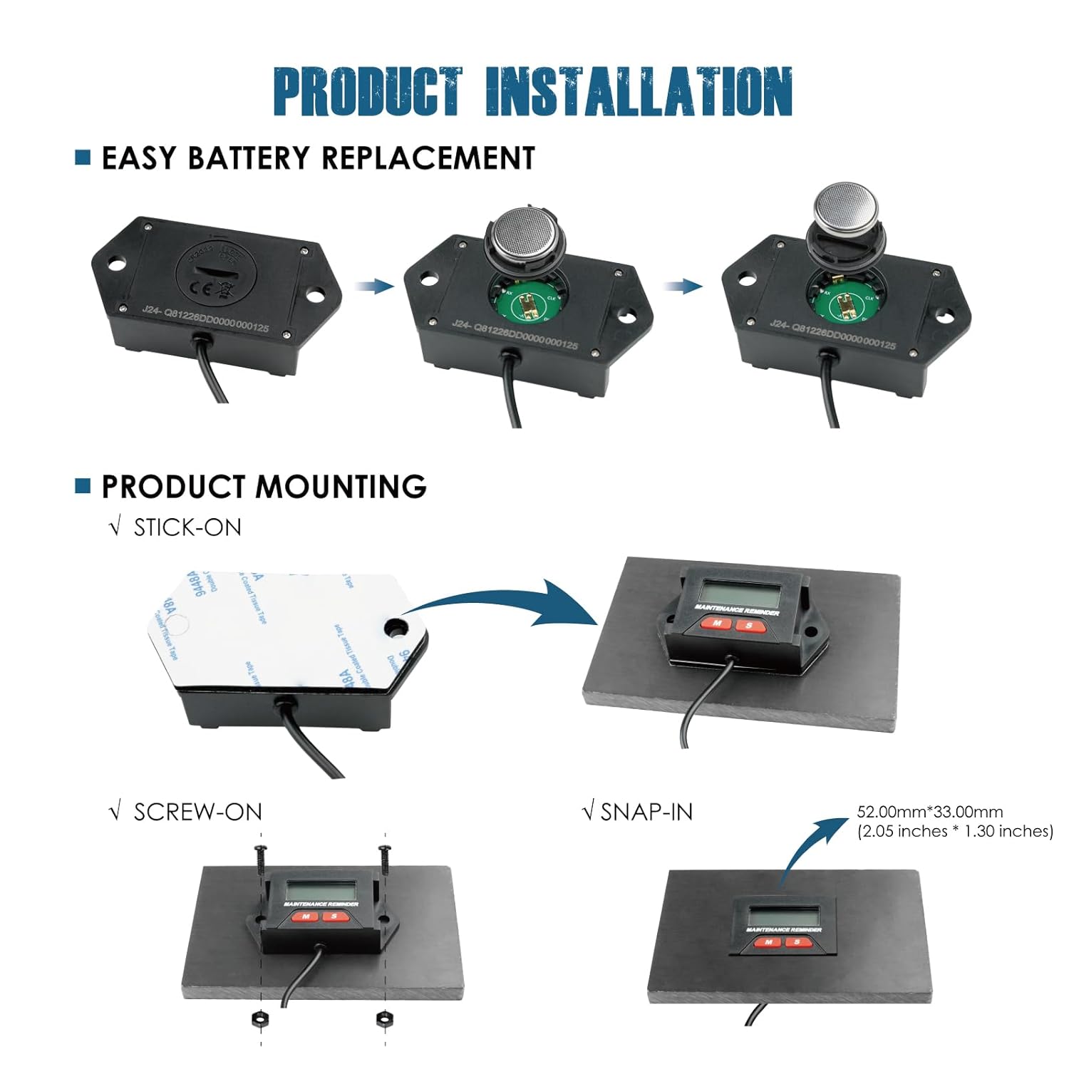 - MOUNTING & SIGNAL CONNECT ---- Use the well-completed accessories by stick-on,screw-on or snap-in mounting at any proper place of equipment; Receipt of engine signal by wire connection with spark plug by wrapping(5-8 circles, inductive cable length:1.75meters/68.8 inches)