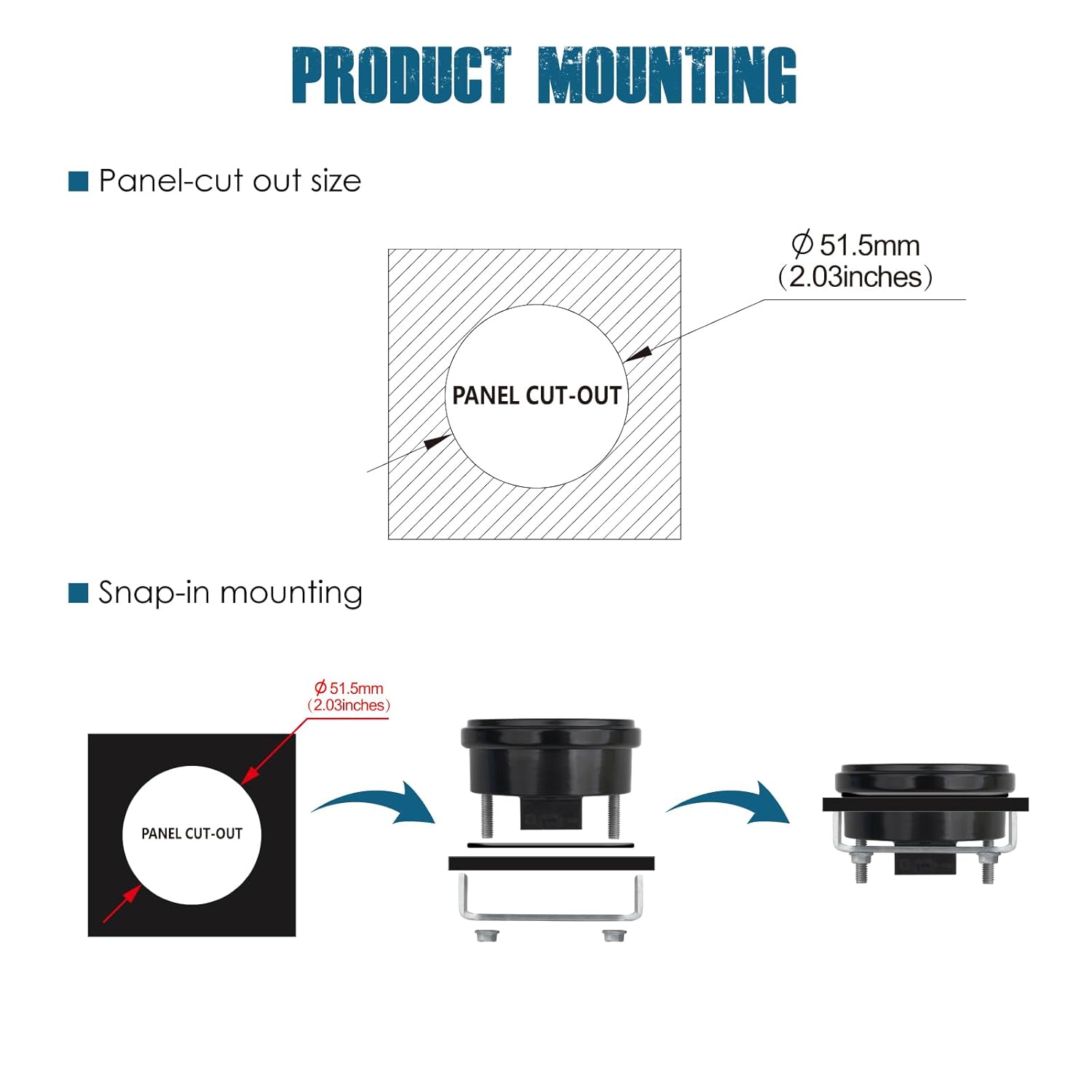- PRODUCT INSTALLATION---- Easy to mount it any proper place by snap-in with bracket by panel cut-out size: φ51.50mm(φ2.03 inches); Connect the external power/battery by connector assembly to start the hours running.